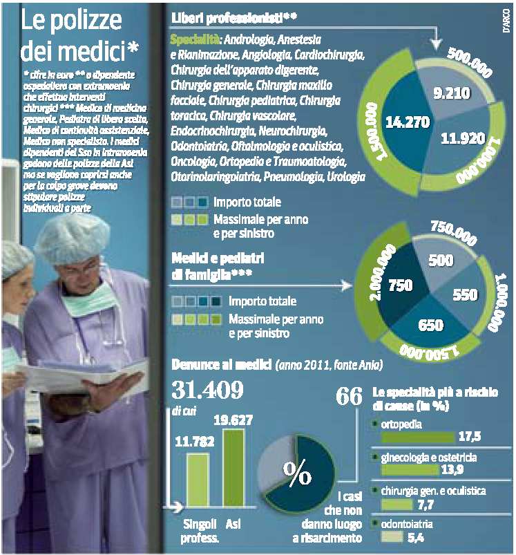 - Anestesisti, ortopedici, otorinolaringoiatri, specialisti di chirurgia vascolare, pediatrica o toracica, odontoiatri dovranno sobbarcarsi cifre poco al di sotto dei diecimila euro. Secondo un’inchiesta tra i broker svolta dall’Ordine dei medici di Roma, per l’attività privata si arriva a una media di 14mila euro circa l’anno, massimali 1 milione e mezzo di euro. La protezione assicurativa dal rischio di un contenzioso per presunta «malpractice» in un parto costa a un ginecologo circa 9 mila euro l’anno, con un massimale di 500mila euro. Tariffa simile per l’autore di un intervento che, ad esempio, dovesse difendersi dall’accusa di non aver operato tempestivamente un paziente con un tumore raro. Più fortunati medici e pediatri di famiglia, che appartengono all’area delle convenzioni, quindi non dipendenti pubblici: da 750 a 2 mila euro all’anno. Il problema dello scudo assicurativo contro le cause di risarcimento, pericolo incombente su tutti i camici bianchi (nel 2010 trentamila casi), sta agitando la categoria.