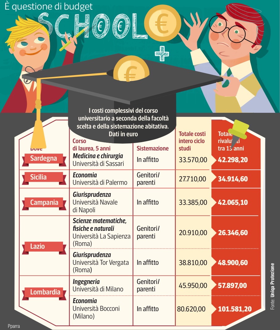 Investire sulla cultura dei figli o nipoti proteggendo il piano finanziario dagli imprevisti. Ecco la ricetta delle polizze vita «a termine fisso», nelle quali il beneficiario è lo studente che può ritirare il capitale a una certa data — come l’inizio degli studi universitari —, mentre l’assicurato è la persona adulta che versa (in genere il genitore). Il capitale maturato a scadenza può essere utilizzato in tutto od in parte per far fronte ai costi dell’intero ciclo di studi oppure per un master all’estero o per il futuro ingresso nel mondo del lavoro. Sono polizze vita del tipo misto, che abbinano al piano di risparmio per la costituzione di un capitale o di una rendita, anche garanzie assicurative, che consentono il completamento del piano, senza versamenti aggiuntivi, nel caso in cui la persona assicurata subisca un’invalidità permanente o venga a mancare. Nei 5 casi presi in esame,l’incasso delle somme è programmato all’età di 19 anni, quando lo studente consegue il diploma di maturità. Il piano di risparmio investe in fondi a gestione separata delle compagnie di assicurazione, con un rendimento minimo garantito annuo (in genere il 2% ). Completano il mix di garanzie i «bonus in conto capitale» riconosciuti da alcuni prodotti a seconda del voto ottenuto dallo studente al termine della scuola superiore (bonus maturità) o al termine del corso universitario (bonus laurea). La polizza Young Doppio Bonus di Uniqa Protezione offre un benefit pari al 10% del capitale maturato a chi si diploma con un voto superiore a 79/100 e un ulteriore bonus laurea (15% del capitale) a chi conclude gli studi universitari in sette anni. Attenzione ai costi, però. Quelli che gravano sui versamenti del piano di risparmio (caricamenti), variabili, a seconda dei casi e dei prodotti, tra il 3% ed il 10%. Considerando il basso rendimento dei titoli di Stato che fanno la parte del leone in questi portafogli, per ottenere somme superiori al totale dei premi corrisposti, bisogna programmare almeno 10 anni di versamenti. Un’innovazione per calcolare il finanziamento di questi piani deriva da un’applicazione per smartphone offerta dalla compagnia Uniqa protezione (scaricabile sul sito http://www.uniqauniversita.it) che consente di calcolare quanto bisogna risparmiare per finanziare gli studi attraverso la polizza. Basta inserire l’età e la tipologia di formazione. I conti nella tabella allegata comprendono invece cinque ipotesi di investimento in polizze per finanziare gli studi universitari di un bambino di 6 anni, con versamenti annui tra i 2 e i 3 mila euro per una durata di 13 anni (Cattolica, “Domani Grande-Piano Università”, Uniqa Protezione “Young Doppio Bonus”, Unipolsai “You risparmio bimbo”, Zurich “Grandi Passi”). Paolo Golinucci —- 27 ottobre 2014 —– CORRIERE DELLA SERA – Corriere Economia RISPARMIO UNIVERSITA’ E LAVORO