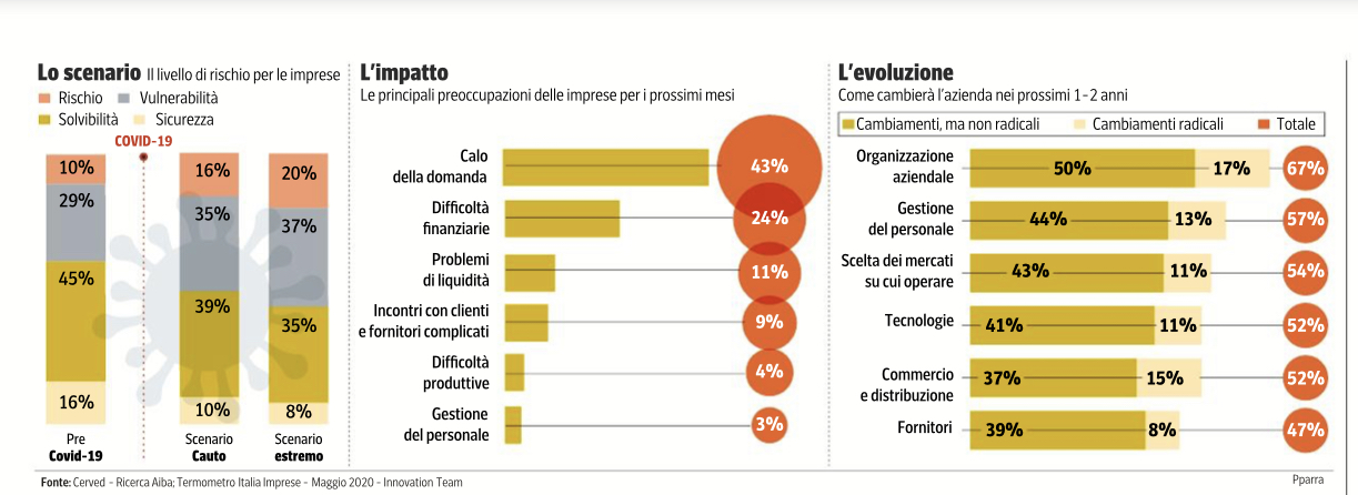 Al tempo del coronavirus , la sfida per il settore assicurativo è aiutare le imprese a non sottovalutare i rischi: sia che si tratti di tutelarsi rispetto a catastrofi naturali, hackeraggi o nuove pandemie. Una necessità ben inquadrata dall’ultima indagine Cerved per Aiba (associazione italiana broker di assicurazione ) che pone l’accento sull’aumento dei rischi per mancata assicurazione dell’impresa. I dati sono uno strumento utile per capire come le aziende Italiane stiano affrontando la crisi economica post Covid-19: un’azienda su sei considera a rischio la propria sopravvivenza ed il 67% delle imprese nei prossimi 2 anni metterà in atto cambiamenti importanti nell’organizzazione aziendale, il 57% nella gestione del personale, il 52% nelle tecnologie ( vedi tabella).