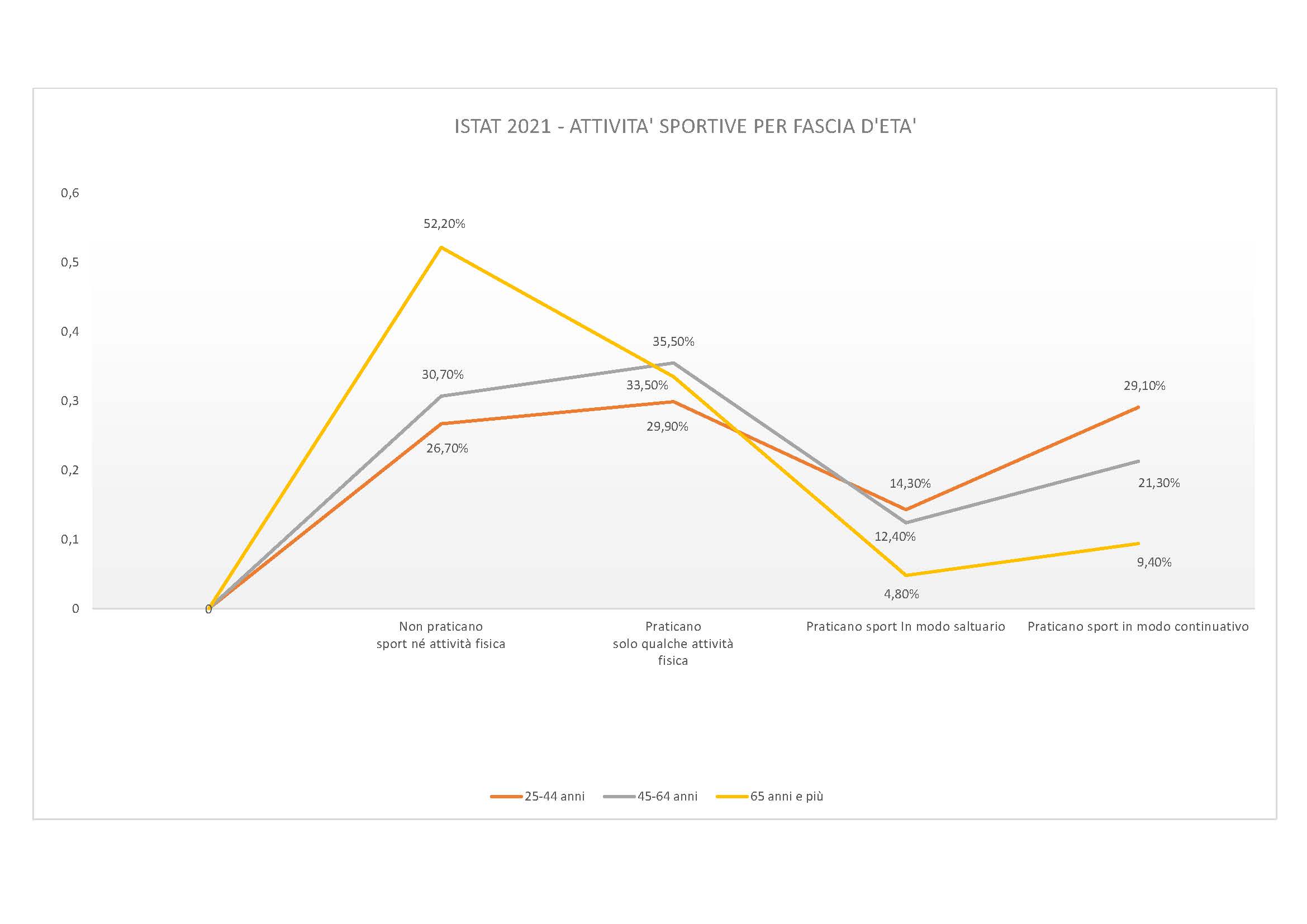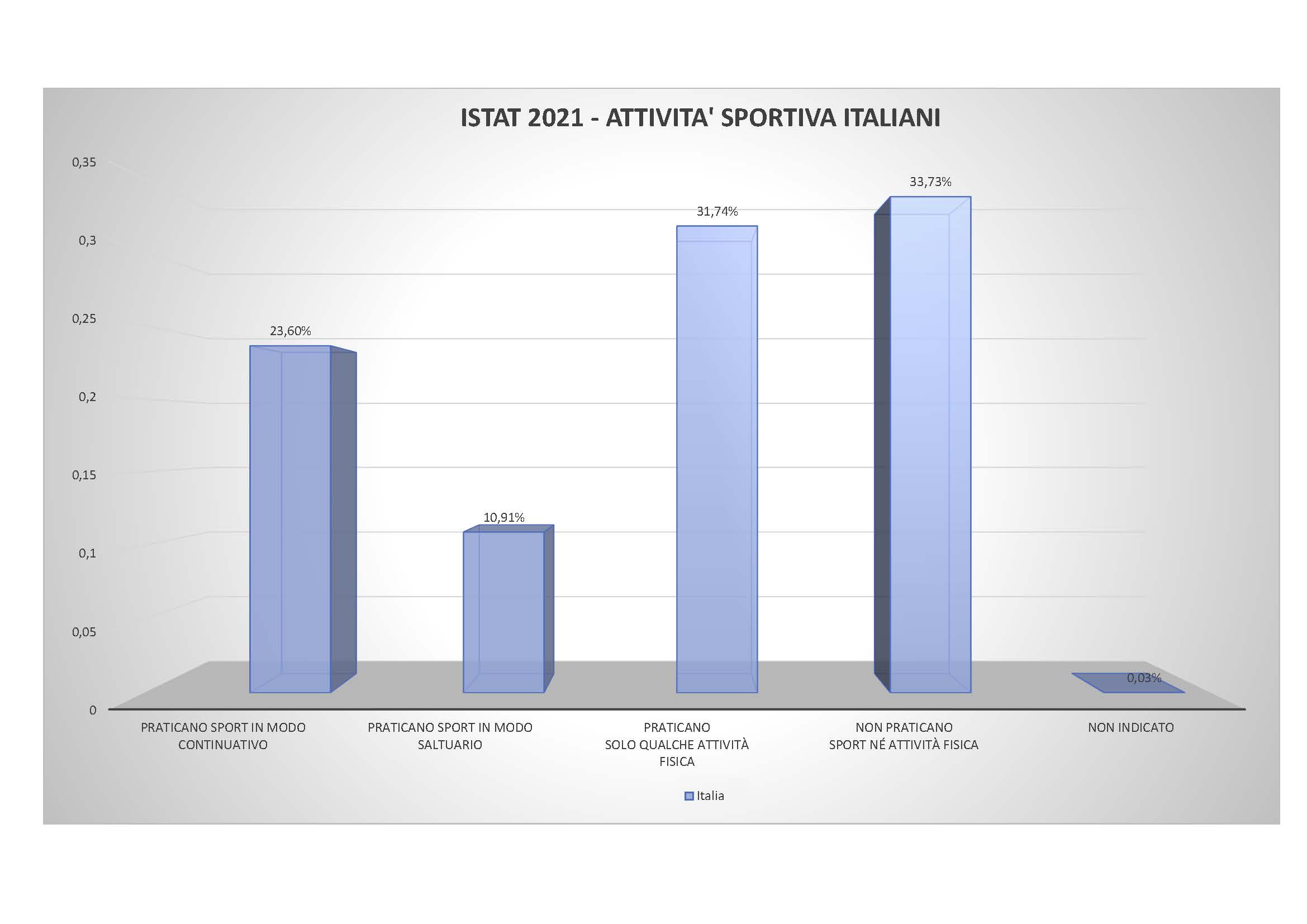 Il 34% degli italiani e’ sedentario, e non pratica alcuna attivita’ fisica. E’ questo uno dei risultati dell’indagine ISTAT, pubblicata il 05 maggio 2022, su “Aspetti della vita quotidiana”, con l’analisi dei fattori di rischio per la salute come sedentarieta’, fumo, obesita’ e alcol. Ben 19 milioni 667 mila persone (il 33,7% della popolazione di 3 anni e più) dichiarano di non praticare né sport né attività fisica nel tempo libero. Si osservano marcate differenze di genere: è sedentario il 36,9% delle donne contro il 30,3% degli uomini.Nel 2021, il 19,0% della popolazione di 14 anni e più dichiara di essere fumatore (9 milioni 958 mila persone), il 24,0% di aver fumato in passato e il 55,7% di non aver mai fumato.