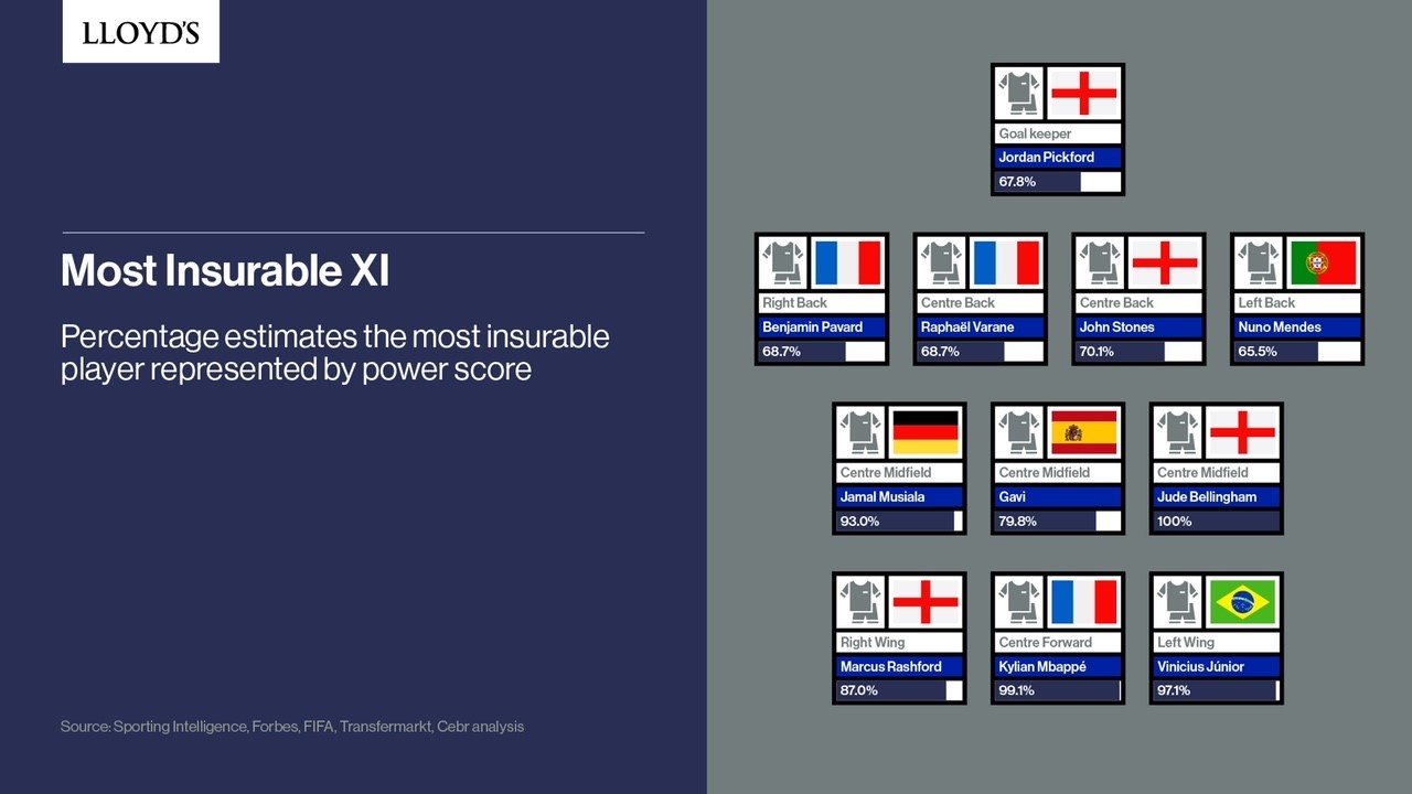 I Lloyd’s hanno stilato anche una classifica del “Dream Team” , composto dai calciatori, per ogni ruolo con il piu’ alto “valore assicurabile”.I giocatori di età compresa tra 18-24 hanno un valore medio assicurabile di 36,8 milioni di euro rispetto ai 13,8 milioni di euro per i giocatori di età superiore ai 31 anni.Rimane il più alto il valore assicurabile medio di un attaccante , con € 39 milioni per persona.Nella tabella allegata sono riportati gli 11 componenti la “Squadra del Torneo”, secondo il “Power Score” che è una misura per confrontare il valore assicurabile dei singoli giocatori :100 % e’ assegnato al giocatore più assicurabile al torneo, 50% al giocatore dal valore mediano. Cosi’ nel Dream Team figura al primo posto , con il 100% di power score, il 19 enne Jude Bellingham , centrocampista dell’Inghilterra , seguito dal centravanti francese Kylian Mbappe’ (99,1%), dall’ala sinistra del Brasile Vinicius Junior (97,1%) e dal centrocampista tedesco Jamail Musiala ( 93%), di 19 anni.