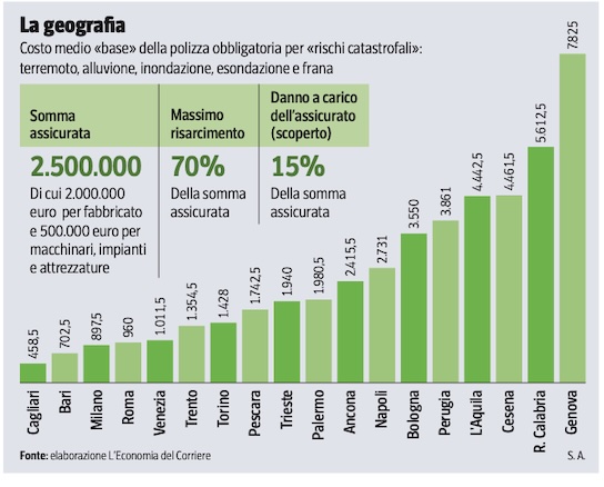 Il premio della polizza viene calcolato in proporzione al rischio, alla vulnerabilità dei beni assicurati, alla storia degli eventi, alle mappe di pericolosità e modelli predittivi. Da un’ indagine de L’Economia, con somme assicurate pari a 2.500.000 euro (2 milioni per fabbricato, 500.000 euro per macchinari, attrezzature,impianti) il costo medio annuo varia da 458 euro (Cagliari) a 898 euro (Milano), ma può arrivare fino a 4.400 euro in zone particolarmente a rischio di alluvioni e terremoti.
