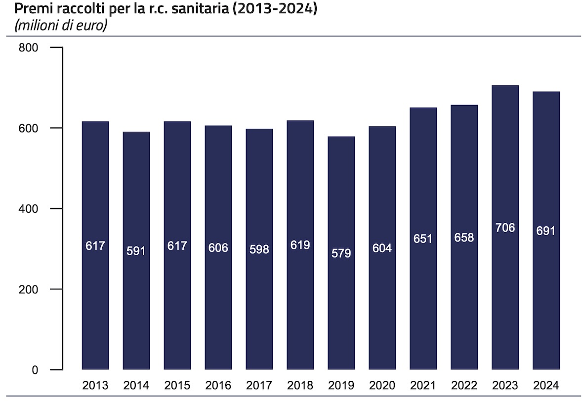 Secondo l’Ivass, l’istituto di vigilanza sulle assicurazioni, nel 2024 in Italia le strutture sanitarie che si sono protette con polizza di responsabilità civile hanno speso 691 milioni di premi, mentre gli ospedali pubblici a tutela della loro «autoritenzione» hanno accantonato circa 500 milioni di euro ed un valore complessivo di fondi per 2,3 miliardi di euro.